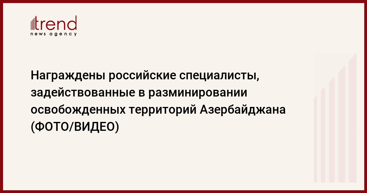 БАКУ /Trend/ - Группа российских специалистов, принявших участие в операции по разминированию освобожденных от оккупации территорий в рамках тесного сотрудничества между Министерством по чрезвычайным ситуациям Азербайджана и Министерством Российской Федерации по делам гражданской обороны, чрезвычайным ситуациям и ликвидации последствий стихийных бедствий, награждены медалями Азербайджана «За заслуги в области военного сотрудничества» и нагрудными знаками «За сотрудничество» МЧС Азербайджана.