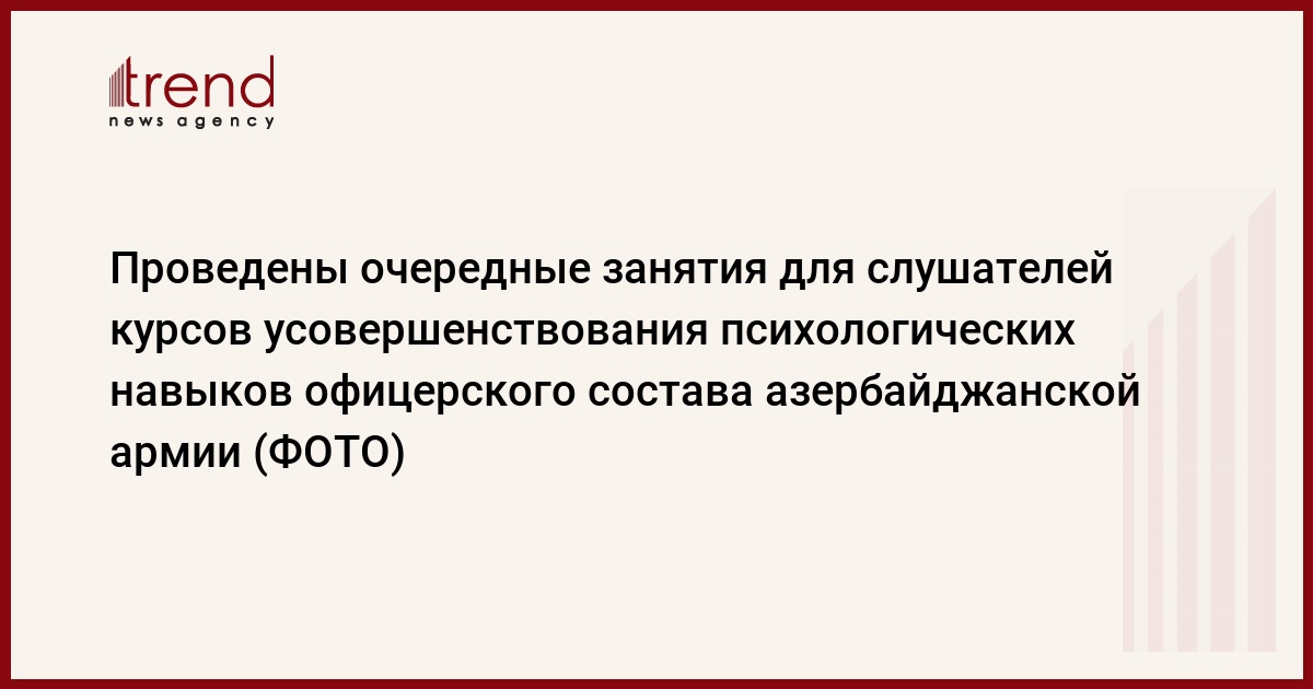 БАКУ /Trend/ - С целью развития теоретических знаний и практических умений слушателей курсов усовершенствования психологических навыков офицерского состава продолжаются дополнительные занятия в рамках учебной программы, проводимой Управлением по идеологической работе и морально-психологическому обеспечению Министерства обороны Азербайджана.