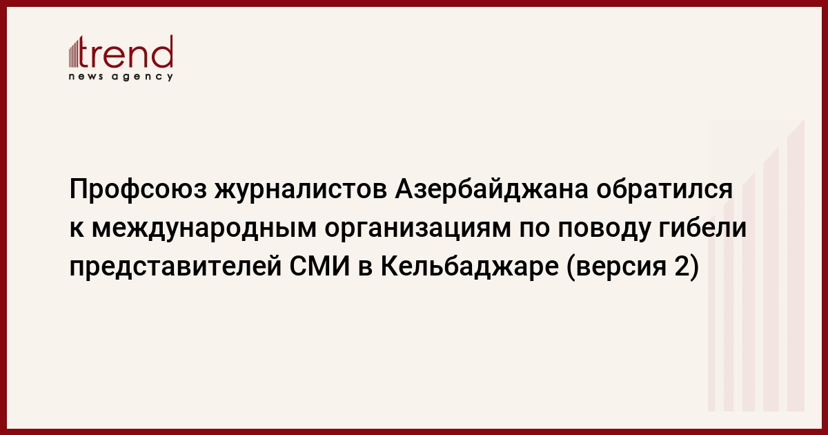 БАКУ /Trend/ - Профсоюз журналистов Азербайджана направил обращение международным организациям по поводу гибели представителей СМИ при исполнении служебных обязанностей в Кельбаджарском районе.
