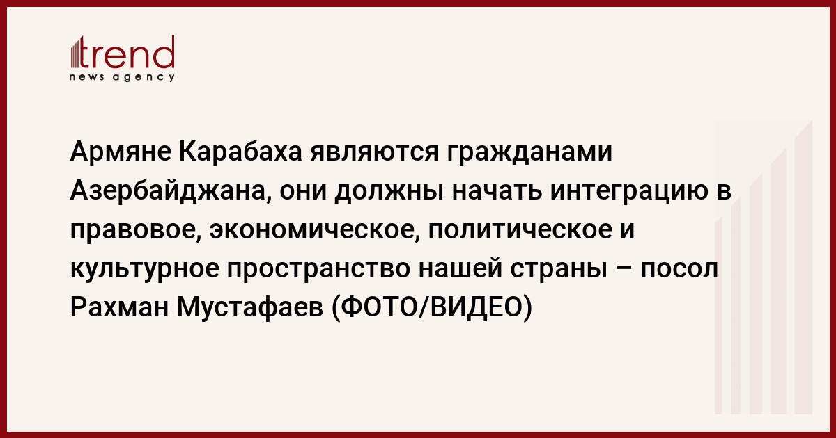 Мустафаев также заявил, что армяне Карабаха являются гражданами Азербайджана, они должны начать интеграцию в правовое, экономическое, политическое и культурное пространство нашей страны. «Территория нашей республики едина и неделима, на ней найдется место и для армян на основе соблюдения принципа равенства всех перед законом», - добавил посол.