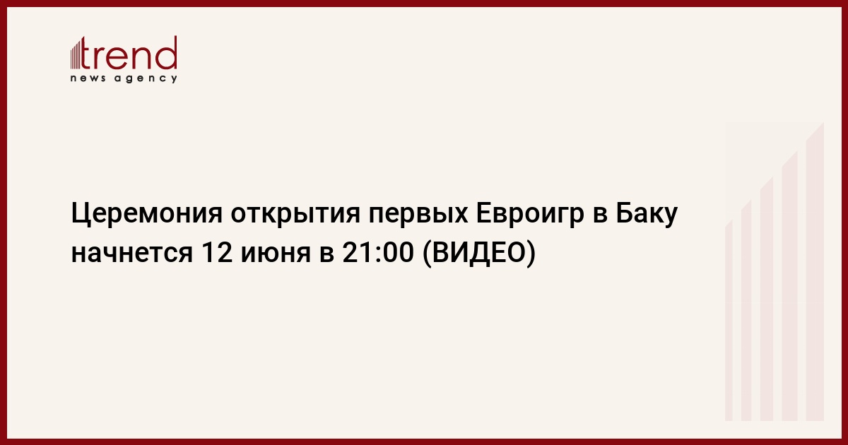 БАКУ /Trend/ - Церемония открытия первых Европейских игр начнется в Баку 12 июня в 21:00 по местному времени. Она будет транслироваться на сайте az.baku2015.com и по всему миру, сообщает во вторник сайт Европейских игр "Баку 2015".