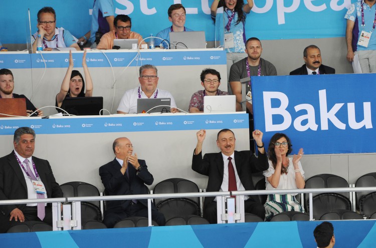 Президент Азербайджанской Республики Ильхам Алиев и его супруга, председатель Организационного комитета первых Европейских игр "Баку-2015" Мехрибан Алиева наблюдали за поединком нашего спортсмена за выход в финал.