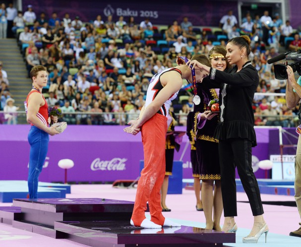 БАКУ /Trend/ - Первая леди Азербайджана, председатель Организационного комитета первых Европейских игр, президент Федерации гимнастики Азербайджана Мехрибан Алиева в субботу приняла участие в церемонии награждения победителей по спортивной гимнастике в упражнениях на коне среди мужчин в рамках Европейских игр в Баку.
