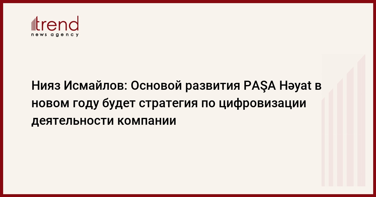 БАКУ/Trend/ - Одна из крупнейших отечественных страховых компаний, уверенно сохраняющая на протяжении последних лет лидерство в сегменте страхования жизни и аккумулирующая почти треть всех сборов на страховом рынке страны – PAŞA Həyat, подвела итоги 2019 года и наметила стратегию развития на будущее. Об этом в интервью Trend рассказал председатель правления компании Нияз Исмайлов.