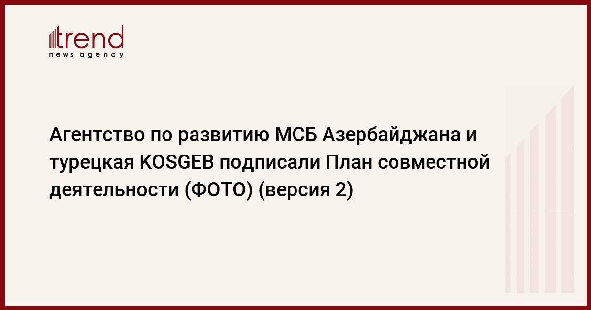 План совместной деятельности охватывает такие вопросы, как изучение опыта Турции в сфере определения влияния и повышения эффективности механизмов государственной поддержки субъектов МСБ, создание Совместной рабочей группы для подготовки информационной базы по субъектам МСБ Азербайджана, использование опыта Фонда развития и инноваций Турции по обеспечению инвестирования в сфере МСБ, сотрудничество в формировании совместных фондов развития МСБ.