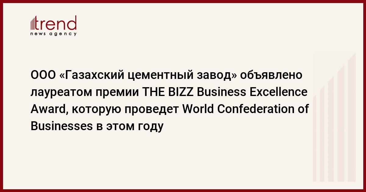 ООО «Газахский цементный завод» за активную бизнес деятельность в 2019-2020 годах, лидерство в бизнесе, качество продукции и услуг, систему управления, инновации и другие достижения в качестве победителя примет участие в церемонии награждения Всемирной конфедерации бизнеса (World Confederation of Businesses, Хьюстон, США), которая пройдет 24-27 ноября 2020 года в Катаре.