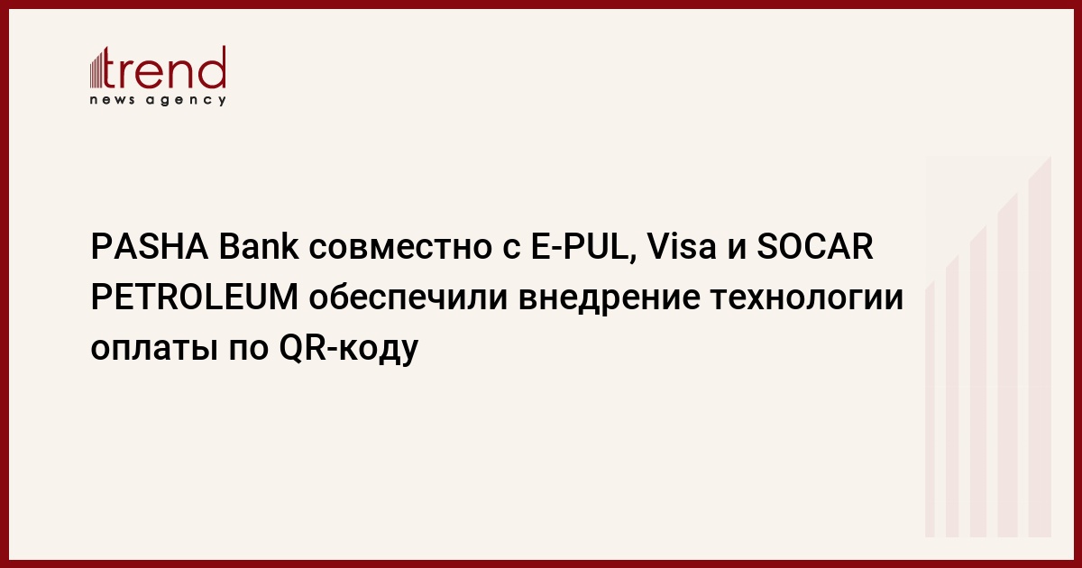 БАКУ/Trend/ - При партнерстве ведущего корпоративного банка Азербайджана PASHA Bank, онлайн-платформы E-PUL, платёжной системы Visa и ЗАО SOCAR PETROLEUM успешно осуществлен запуск платежного решения на основе QR-технологии в сети АЗС SOCAR.