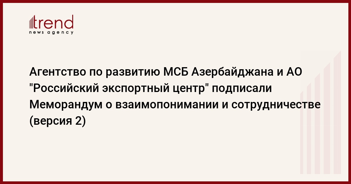 БАКУ /Trend/ - 17 ноября АО "Российский экспортный центр" и Агентство Азербайджана по развитию малого и среднего бизнеса (МСБ) подписали Меморандум о взаимопонимании и сотрудничестве, сообщает в среду Trend со ссылкой на агентство.