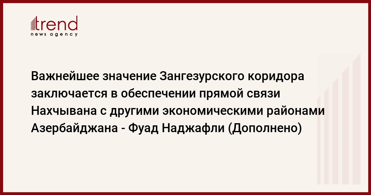 БАКУ /Trend/ - Важнейшее значение Зангезурского коридора будет заключаться в обеспечении прямой связи между Нахчываном и другими экономическими районами Азербайджана. Тем самым также еще больше повысится экономическое и транзитное значение Нахчывана, будут определены новые направления развития.