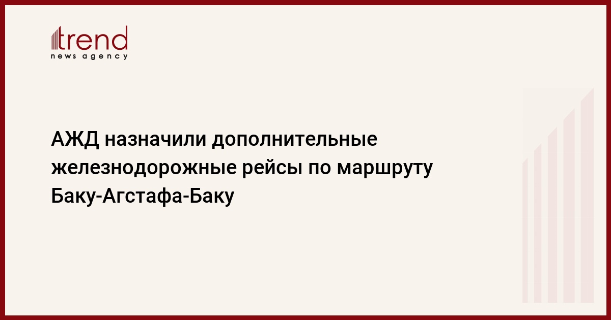 БАКУ /Trend/ - В связи с растущим пассажиропотоком по маршруту Баку-Агстафа-Баку ЗАО "Азербайджанские железные дороги" назначило на 8-9 июля 2023 года дополнительные рейсы в обоих направлениях.
