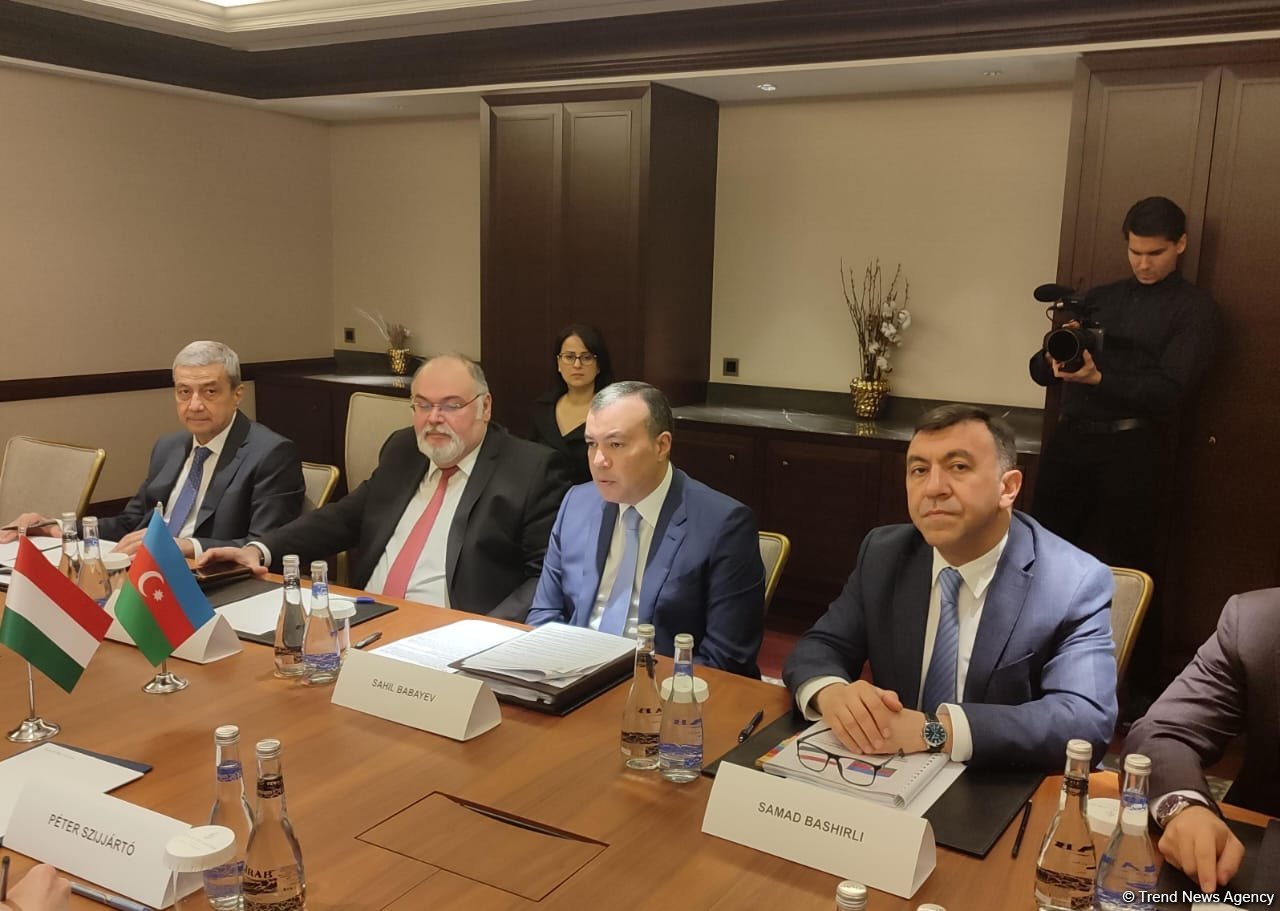В заседании принимают участие делегация во главе с министром иностранных дел и торговли Венгрии Петером Сийярто и делегация во главе с министром труда и социальной защиты населения Азербайджана Сахилем Бабаевым.