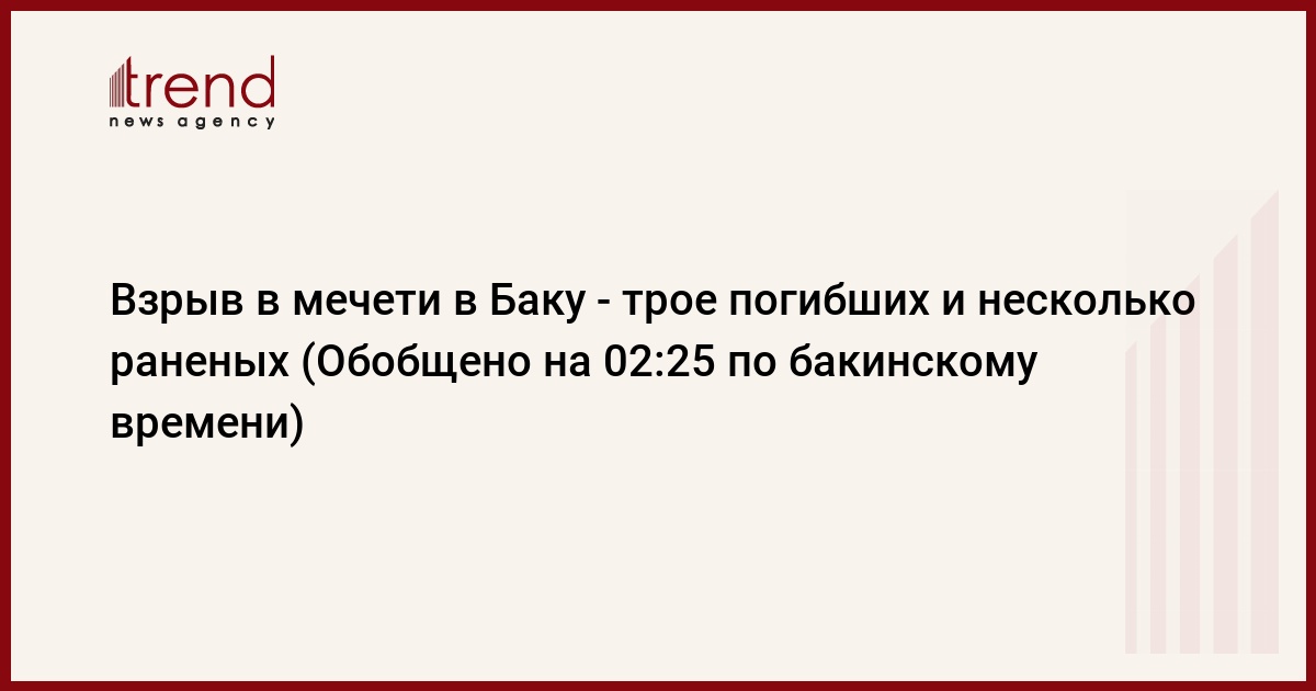 Азербайджан, Баку, 18 августа / Trend / В мечети Абу-Бекр в Баку в воскресенье около 21.00 по местному времени во время вечерней молитвы прогремел взрыв. Как передает корреспондент Trend с места события, по словам очевидцев, неизвестный разбил окно мечети камнем и бросил внутрь две гранаты РГД-1, в результате погибли три человека, восемь получили ранения.