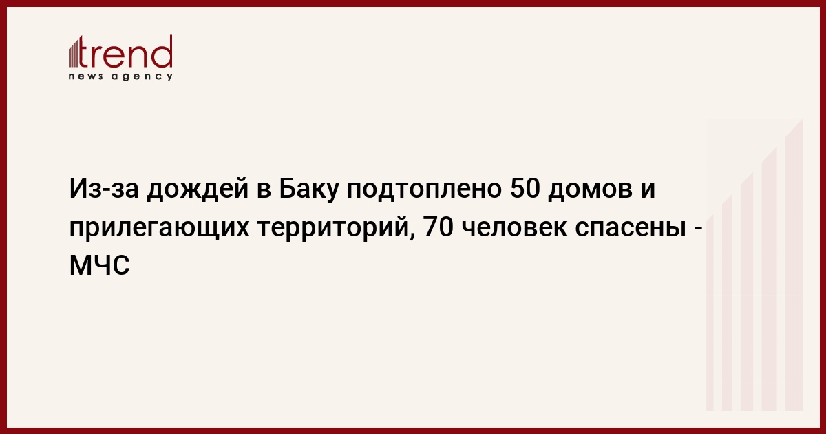 В результате интенсивных дождей 23-24 апреля около 50 частных домов и прилегающих участков в Сабунчиснком районе Баку было подтоплено, около 70 человек было спасено, говорится в сообщении министерства по чрезвычайным ситуациям Азербайджана.