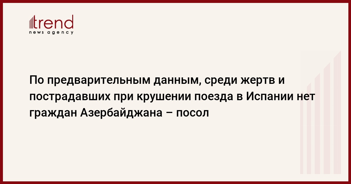 "Посольство Азербайджана связалось с соответствующими структурами Испании, а также по "горячей линии", которая создана для информирования близких и родственников пострадавших при крушении поезда в Испании, где сообщили, что в списках жертв и пострадавших нет граждан Азербайджана", - сказал в четверг Trend посол Азербайджана в Испании Алтай Эфендиев.