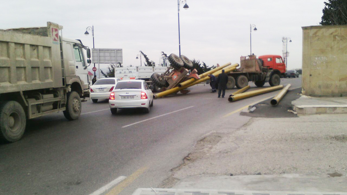 БАКУ /Trend/ -Утром 23 апреля на Зыхском шоссе в Баку при повороте на Нахчыванский круг перевернулся прицеп грузового автомобиля марки КАМАЗ, сообщает в четверг корреспондент Trend с места происшествия.