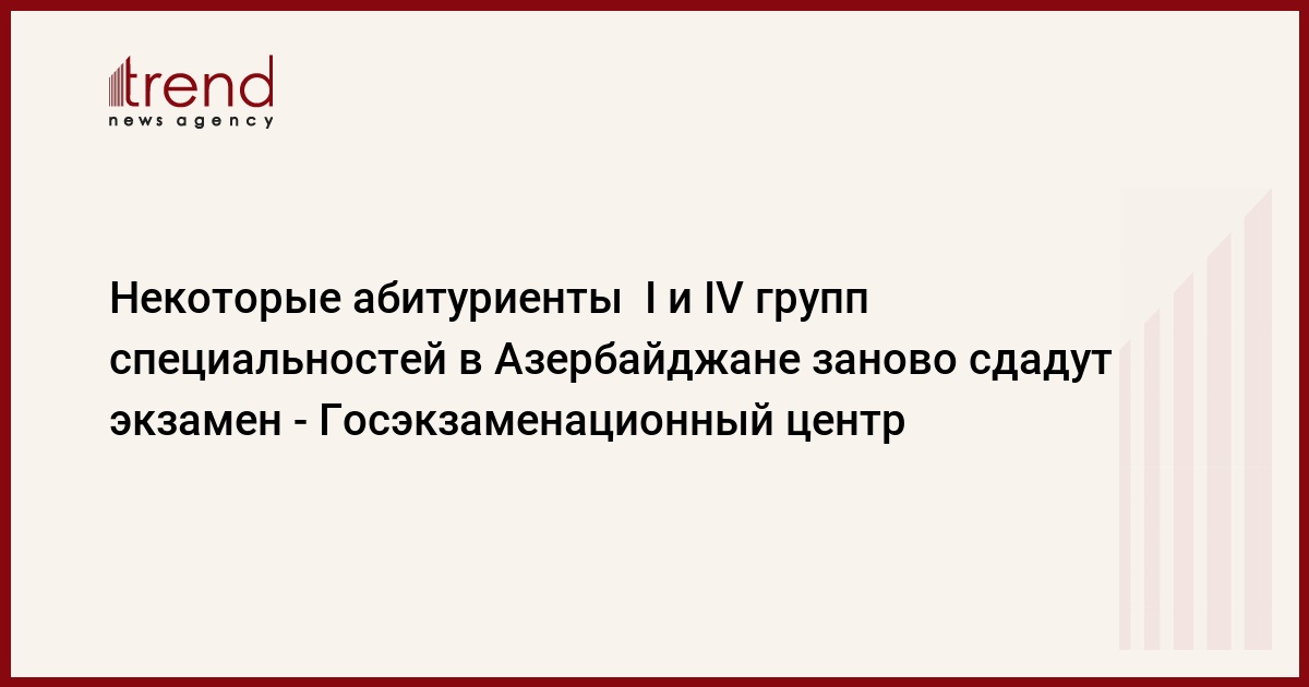 БАКУ /Trend/ - Абитуриенты I и IV групп специальностей, участвовавшие сегодня в приемном экзамене, проходившем в здании Азербайджанского университета кооперации, заново сдадут экзамен, говорится в сообщении Государственного экзаменационного центра (ГЭЦ), распространенном в субботу.