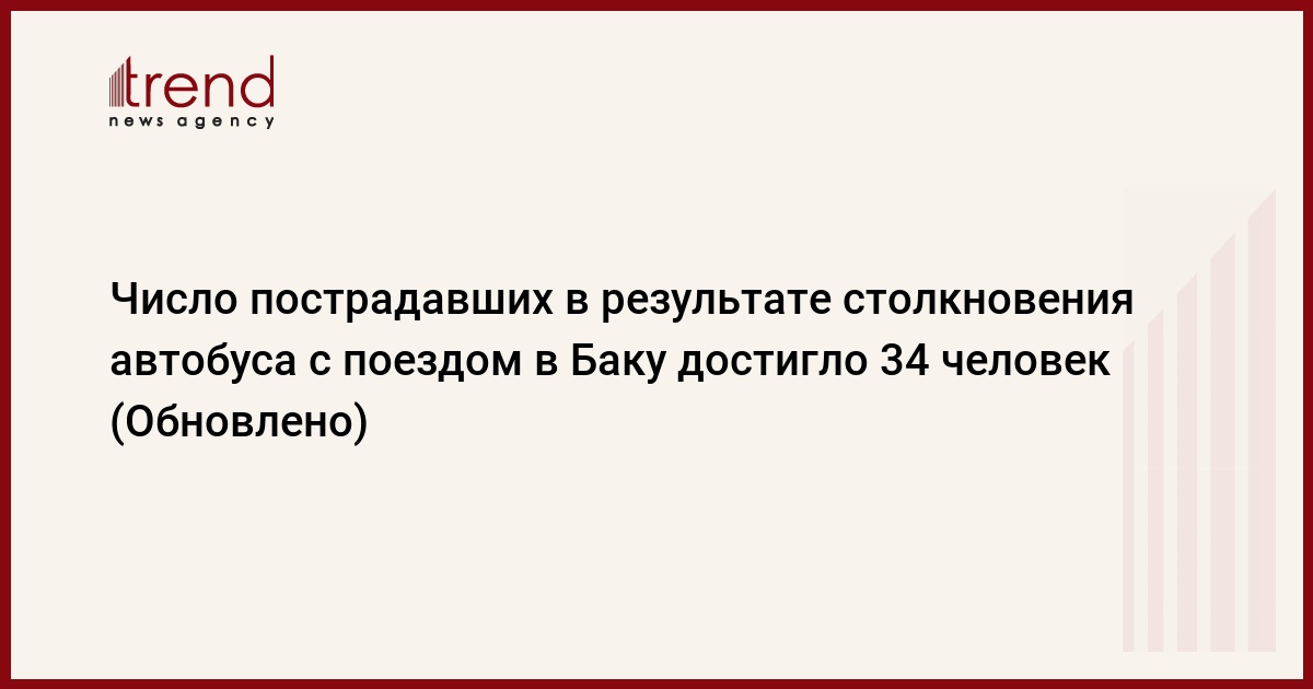 БАКУ /Trend/ - 17:31 (GMT+4) 34 человека пострадали и один человек погиб в результате столкновения автобуса номер 160 с поездом в поселке Бина Хазарского района Баку.