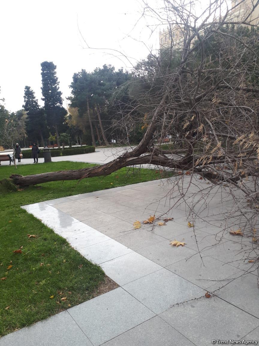 Также ветер с корнем вырвал огромное дерево в парке Академии наук Азербайджана. На место происшествия прибыли сотрудники Объединения хозяйства озеленения Исполнительной власти Баку, дерево убрано с территории.