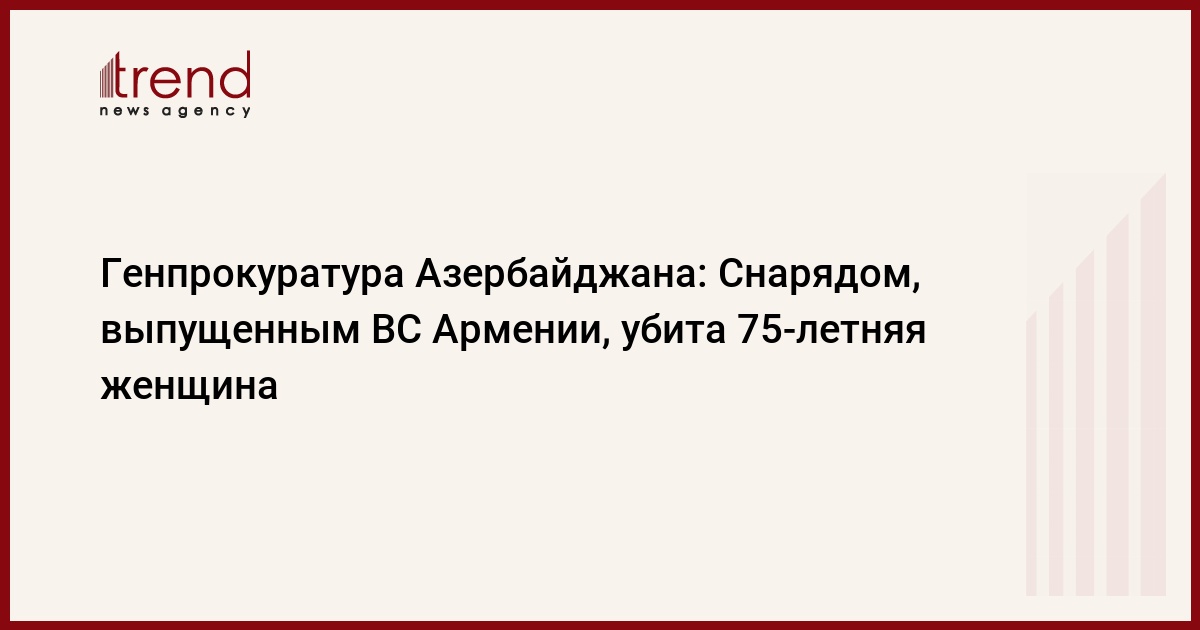 БАКУ /Trend/ - Снарядом, выпущенным ВС Армении, убита жительница села Хындырыстан Агдамского района 75-летняя Алиева Зарифа Гамбой гызы (1945), сообщает в среду Trend со ссылкой на генеральную прокуратуру Азербайджана.