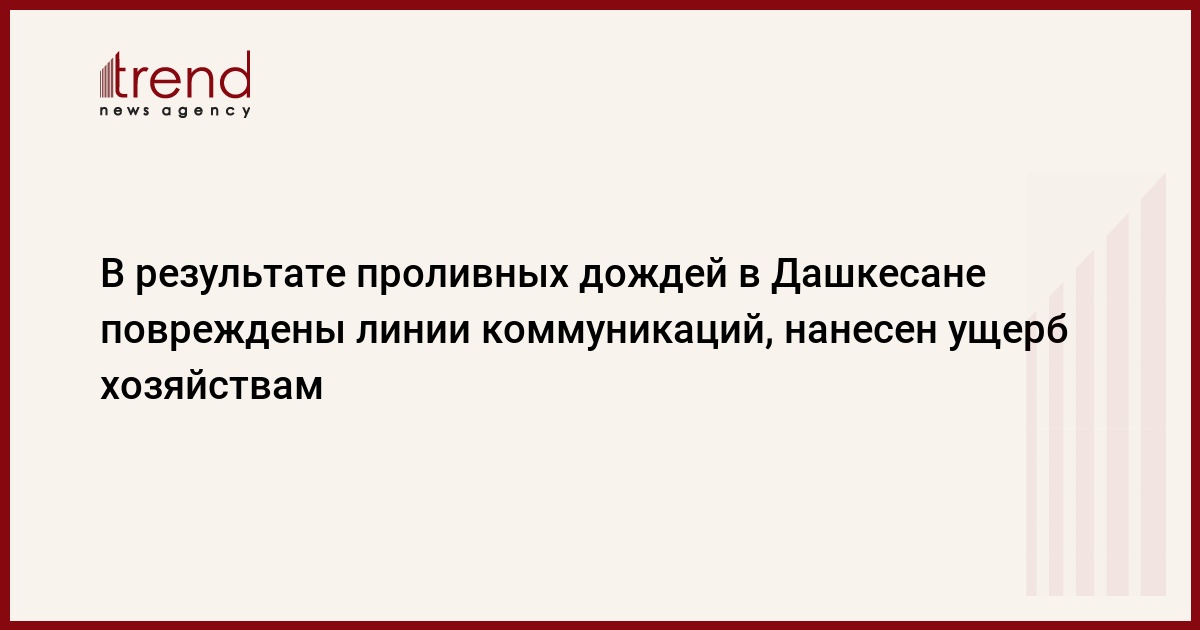 БАКУ /Trend/ - Проливные дожди в Дашкесанском районе Азербайджана с вечера 10 июня вызвали кратковременные паводки на некоторых горных реках, повредили ряд коммуникационных линий, мосты, нанесен ущерб хозяйствам граждан, потоки воды унесли несколько автомобилей.