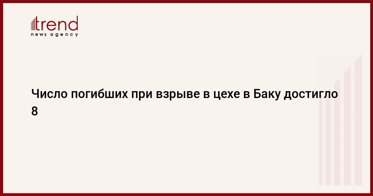 БАКУ /Trend/ - Спасатели МЧС обнаружили под завалами тело еще одного погибшего при взрыве в цехе на улице А.Кунанбаева в Бинагадинском районе Баку. Тем самым число погибших достигло 8.