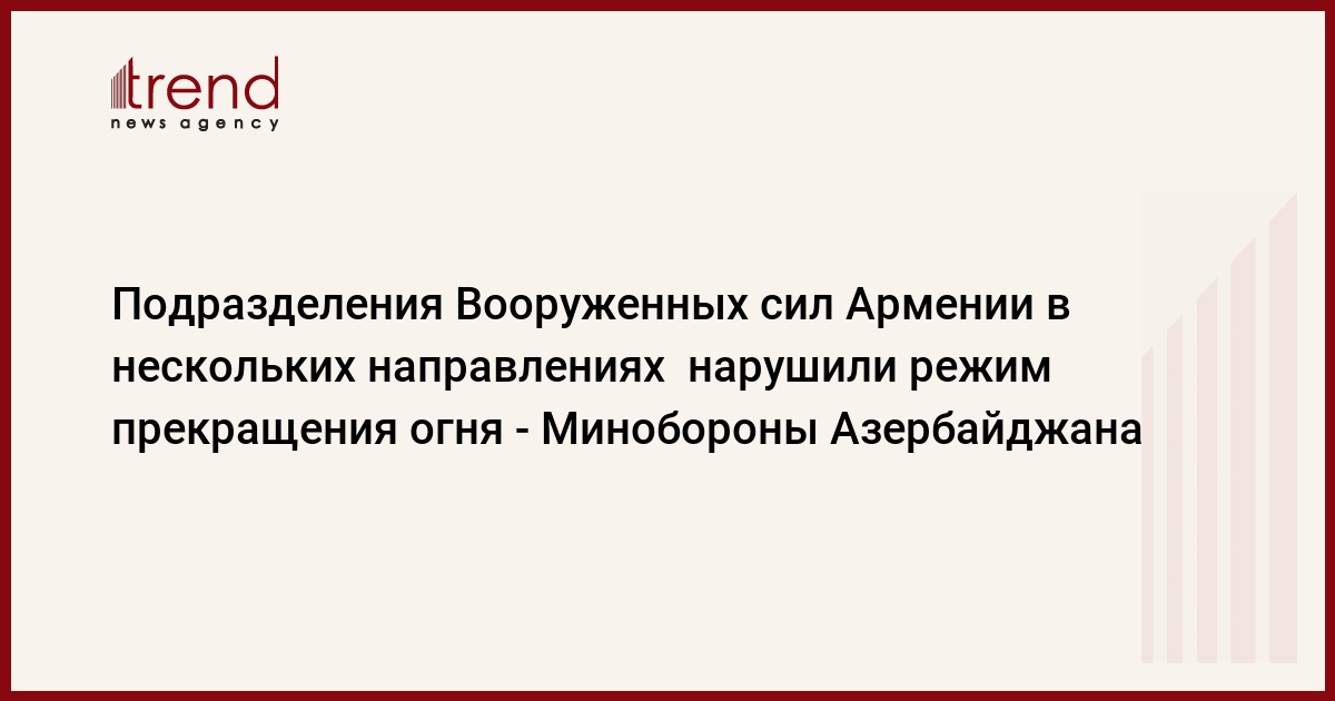 Азербайджан, Баку, 23 августа /корр. Trend Э.Гусейнли/ Подразделения Вооруженных сил Армении 23 августа с 01:30 до 01:40 и 02:00 до 02:20 с перерывами с позиций, расположенных на территории сел Чинари и Мосесгех Бердского района, подвергли обстрелу противоположные позиции азербайджанских Вооруженных сил, дислоцированных на безымянных высотах Агдамского района. Вчера с 07:15 до 07:20, с 20:50 до 20:55 и с 22:30 до 23:30 с позиций близ села Куропаткино Ходжавендского района, с 08:55 до 09:20 с мест дислокаций близ села Ашагы Абдулрахманлы Физулинского района, с 23:10 до 23:40 с безымянных высот на территории Физулинского района подвергли автоматно-пулеметному обстрелу противоположные позиции азербайджанских ВС. Об этом сообщили в пресс-службе Минобороны Азербайджана.