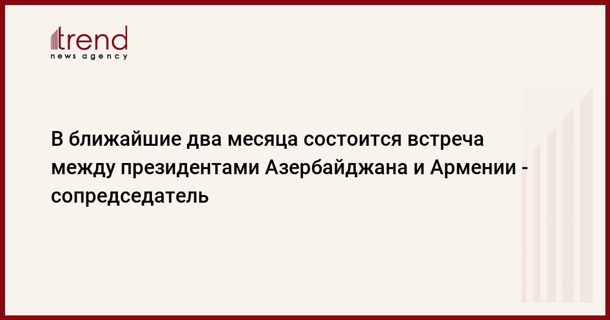 Азербайджан, Баку, 3 марта /корр. Trend Э.Рустамов/ В ближайшие два месяца состоится встреча между президентами Азербайджана и Армении. С таким заявлением сегодня в Баку на пресс-конференции выступил российский сопредседатель Минской группы ОБСЕ Юрий Мерзляков. По словам дипломата, обе стороны поддержали данную идею.