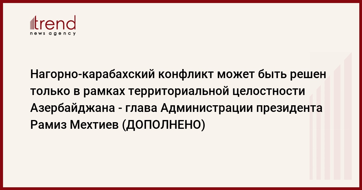 Нагорно-карабахский конфликт может быть решен только в рамках территориальной целостности Азербайджана, сказал в пятницу глава Администрации президента Азербайджана Рамиз Мехтиев на первом форуме азербайджано-российской общественности, который проходит в Баку.