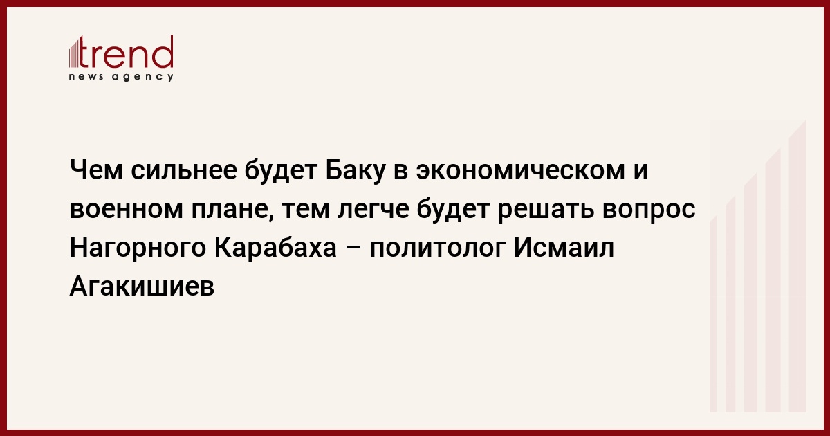 - Оба вопроса - и вопрос территориальной целостности, и вопрос самоопределения - имеют право на существование. Потеря территориальной целостности Азербайджаном произошла не по вине Азербайджана, это результат тех событий, которые происходили на территории СССР в конце 80-х годов. На сегодняшний день Азербайджан ведет правильную политику - мирные переговоры и, с другой стороны, укрепление армии. Чем Баку будет сильнее в экономическом и военном плане, тем легче будет решать вопрос Нагорного Карабаха. То предложение, которое сейчас делает армянской стороне руководство Азербайджана, это даже не компромисс, это единственный правильный выход из ситуации. Армения сегодня мононациональное государство, в отличие от Азербайджана, в котором национальный вопрос не стоит. Азербайджан согласен на мирное существование обеих национальностей на территории Нагорного Карабаха. Но армянское руководство проводит совершенно другую политику национализма, при которой невозможно представить возвращение азербайджанских беженцев в Нагорный Карабах.