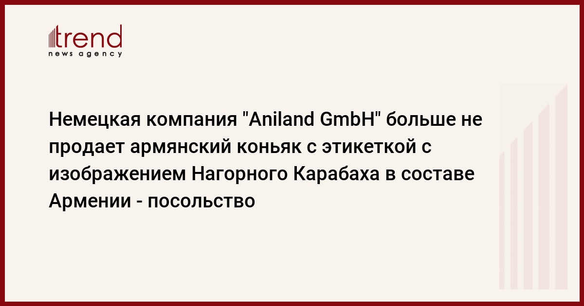 Немецкая компания "Aniland GmbH" больше не продает армянский коньяк с этикеткой, на которой Нагорный Карабах указывается в составе Армении, говорится в ответном письме руководства компании на обращение почетного консульства Азербайджана в Штутгарте.
