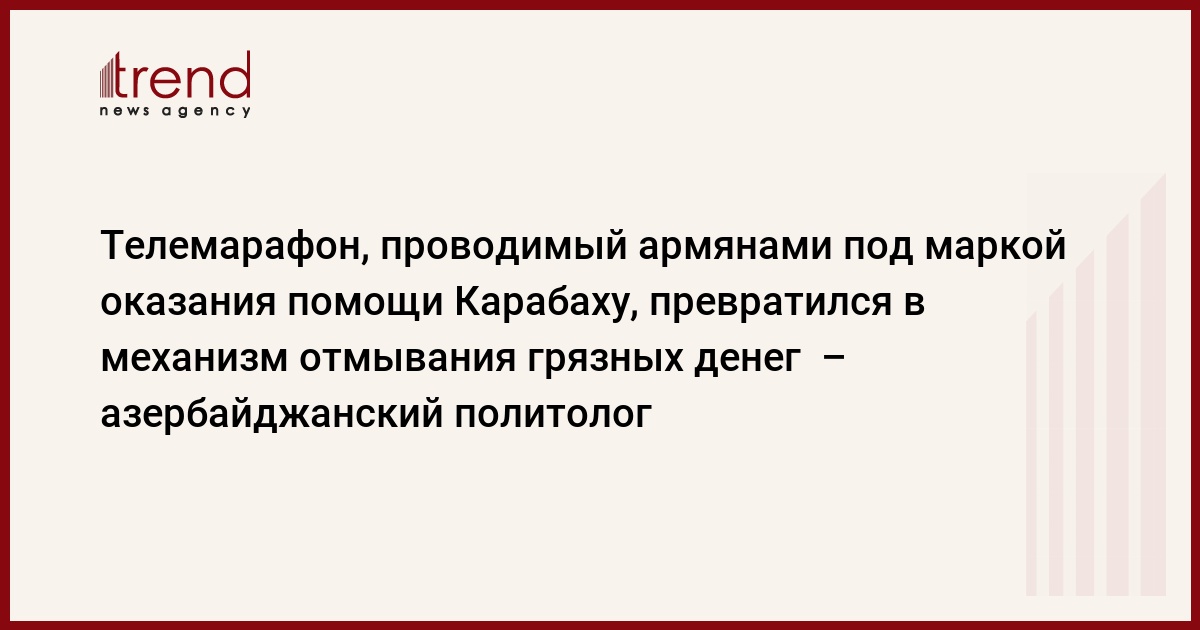 Есть основания полагать, что телемарафон, проводимый фондом "Hayastan" под маркой оказания помощи Карабаху, давно превратился в механизм отмывания грязных денег криминальных элементов. Об этом в понедельник Trend сказал директор Центра политических инноваций и технологий, политолог Мубариз Ахмедоглу.