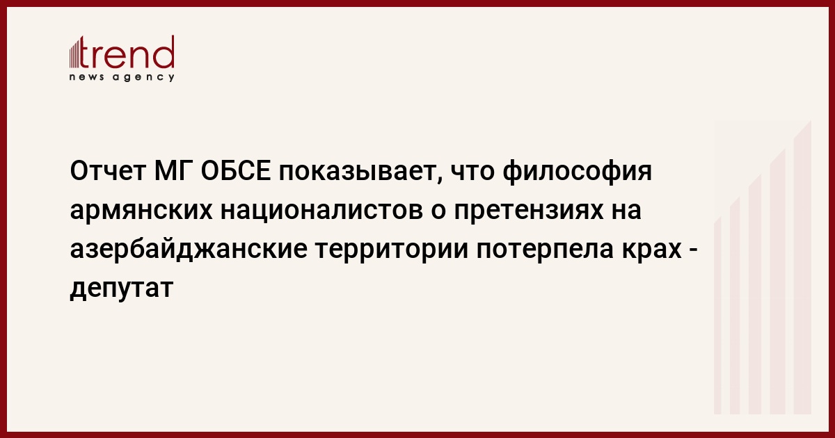 Отчет оценочной миссии Минской группы ОБСЕ, связанный с ситуацией на оккупированных азербайджанских территориях, показывает, что философия армянских националистов о претензиях на азербайджанские территории потерпела крах, сказал в пятницу Trend депутат парламента Азербайджана Айдын Мирзазаде.