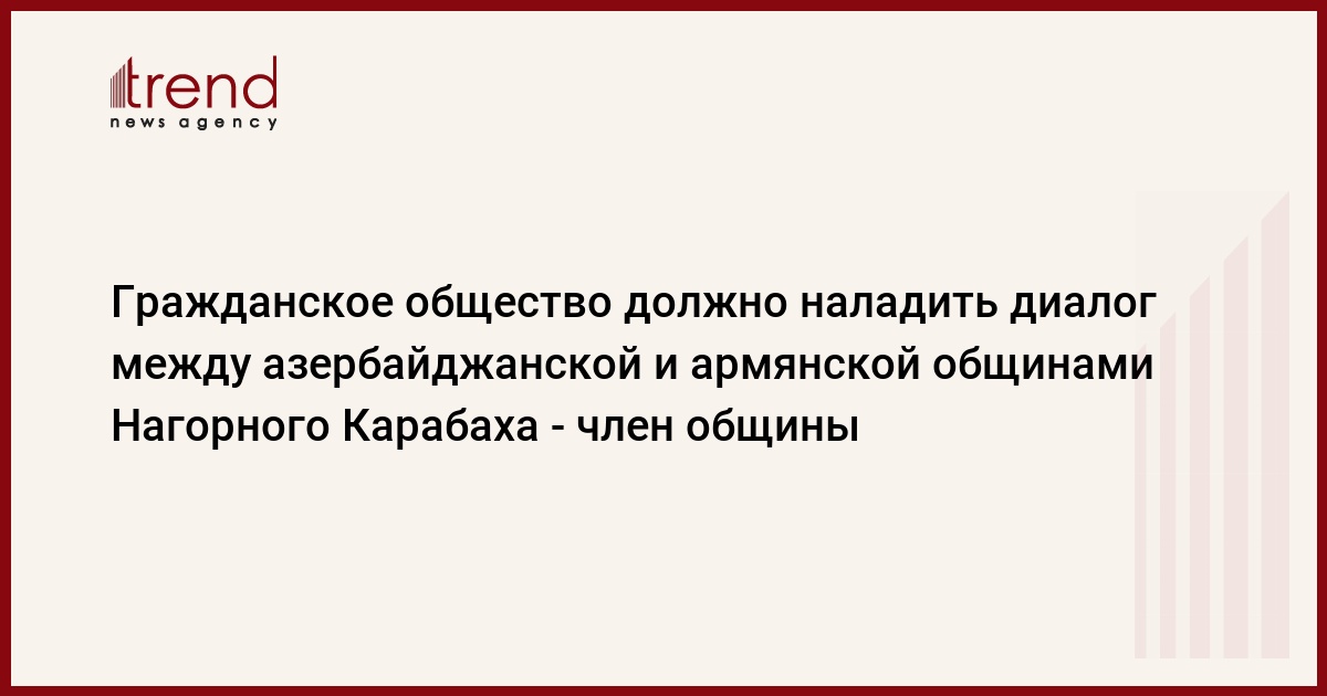 На гражданское общество возлагается большая работа по налаживанию диалога между азербайджанской и армянской общинами Нагорного Карабаха, сказал в среду Trend член Общественного объединения "Азербайджанская община Нагорно-Карабахского региона" Ровшан Рзаев.