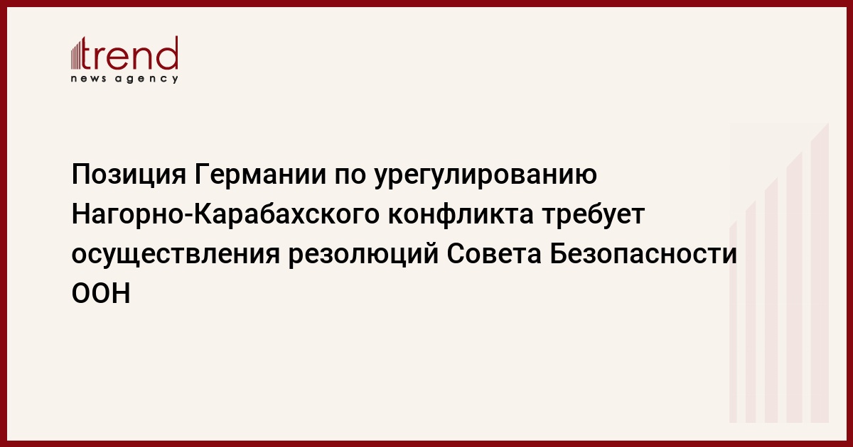 Позиция немецкого правительства по урегулированию Нагорно-Карабахского конфликта требует осуществления резолюций Совета Безопасности ООН, об этом сообщило Trend посольство Азербайджана в Германии. Ранее по инициативе посольства было направлено обращение в Бундестаг ФРГ, в связи с незаконным посещением депутатом фракции Христианско-демократический союз / Христианско-социальный союз (CDU/CSU) Юргена Климке оккупированных территорий Азербайджана. В ответ на обращение был получен официальный ответ.