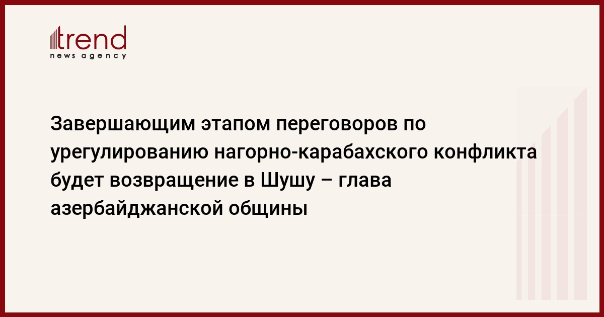 Завершающим этапом переговоров по урегулированию нагорно-карабахского конфликта будет возвращение в Шушу. Об этом в понедельник сказал журналистам глава азербайджанской общины Нагорно-карабахского региона Байрам Сафаров.