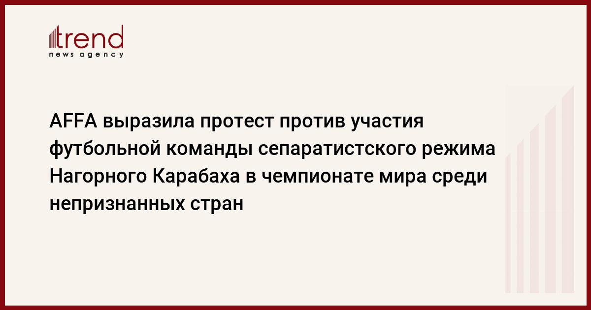 Ассоциация футбольных федераций Азербайджана (AFFA) выразила протест Конфедерации непризнанных футбольных федераций (ConiFA) в связи с планируемым участием футбольной команды сепаратистского режима Нагорного Карабаха в чемпионате мира среди непризнанных стран. Об этом сообщает в четверг сайт AFFA.
