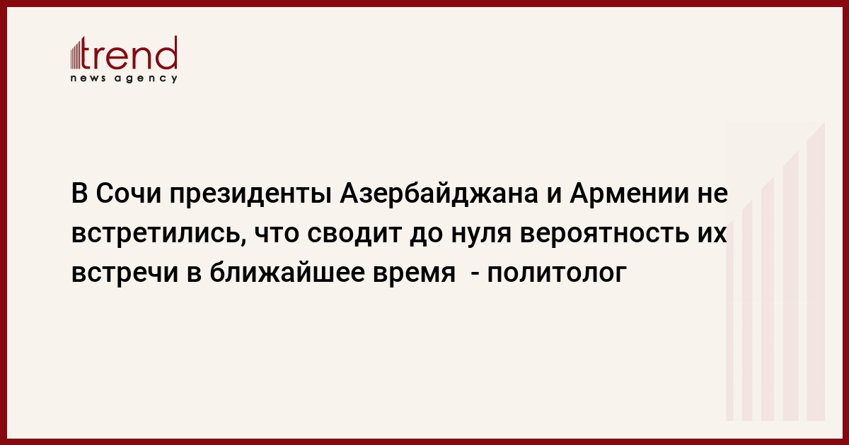 "Через некоторое время оба президента приехали в Сочи на открытие Олимпиады. Президент России Владимир Путин тоже там находился. Олимпийский период и место проведения Олимпиады всегда считались удобными для мирных переговоров. Несмотря на одновременное пребывание на Олимпиаде трех президентов, никто, включая сопредседателей, не выдвинул инициативу об их встрече. Вспоминая заявление главы МИД Азербайджана, можем сказать, что Армения не приняла азербайджанское предложение о начале работы над большим мирным соглашением (БМС). Если Саргсян считает подготовку БМС деструктивным делом, значит таково его мышление", - отметил политолог.