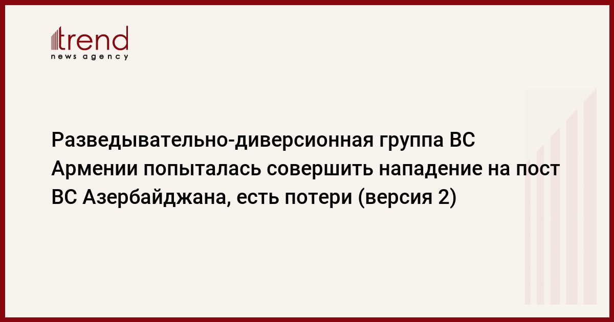 Разведывательно-диверсионная группа ВС Армении вновь попыталась совершить нападение на пост ВС Азербайджана, есть потери с обеих сторон, говорится в сообщении пресс-службы минобороны Азербайджана, распространенном в среду.