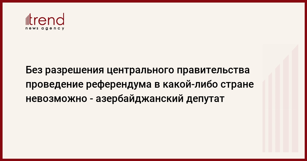 БАКУ /Trend/ - Без разрешения центрального правительства проведение референдума в какой-либо стране невозможно. Об этом сказал в понедельник зампредседателя комитета по политическим вопросам и безопасности Парламентской ассамблеи (ПА) ОБСЕ, член бюро Азай Гулиев, комментируя дополнения и изменения к проекту резолюции "Хельсинки+40: К безопасности каждого человека", обсуждаемой на заседании комитета.