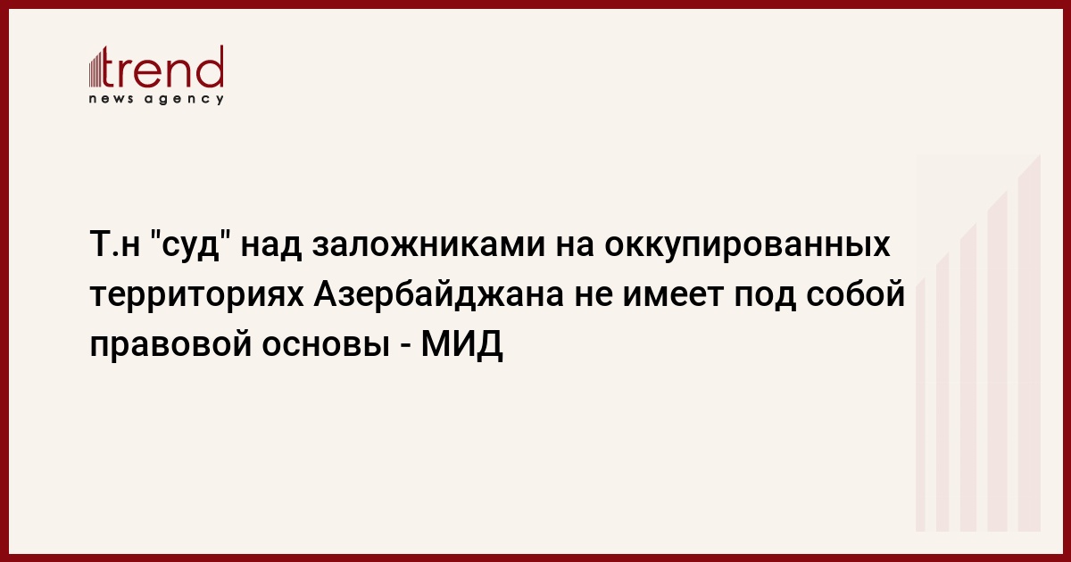 БАКУ /Trend/ - Деятельность т.н. "суда", организованного на оккупированных территориях Азербайджана, никакой правовой основы под собой не имеет, как и вынесенные им "решения". Об этом сказал в понедельник Trend и.о. главы пресс-службы МИД Азербайджана Хикмет Гаджиев, комментируя информацию, распространенную в армянских СМИ о завершении т.н. "суда" в отношении азербайджанских заложников Дильгама Аскерова и Шахбаза Гулиева.