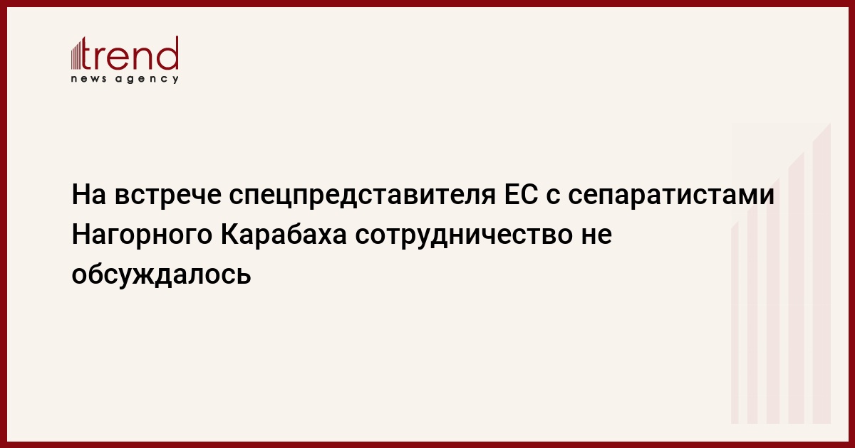БАКУ /Trend/ - Встреча спецпредставителя ЕС по Южному Кавказу и кризису в Грузии Герберта Зальбера с т.н. "министром иностранных дел" сепаратистского режима Нагорного Карабаха Кареном Мирзояном в Ереване была нацелена на налаживание диалога между азербайджанской и армянской общинами Нагорного Карабаха, а не на сотрудничество. Об этом сообщили Trend в среду в представительстве ЕС в Азербайджане, комментируя данный факт.