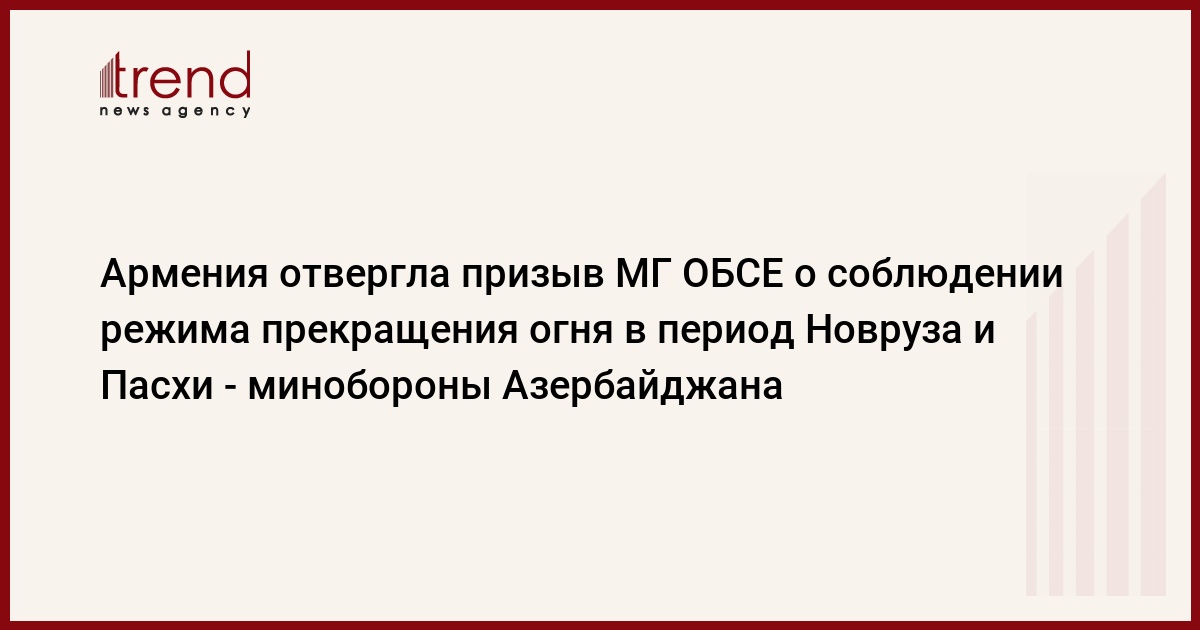 БАКУ/ Trend/ - Армения в одностороннем порядке отвергла призыв сопредседателей Минской группы (МГ) ОБСЕ о серьезном соблюдении режима прекращения огня в период праздников Новруз и Пасха. Об этом говорится в сообщении минобороны Азербайджана, распространенном в четверг.