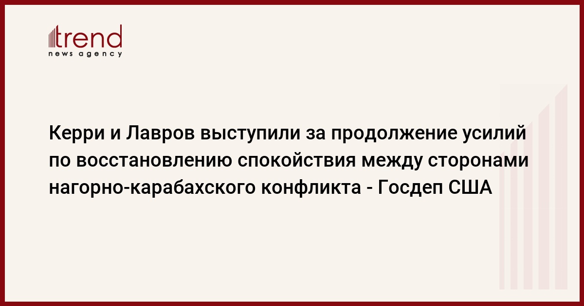 БАКУ /Trend/ - Министр иностранных дел России Сергей Лавров и госсекретарь США Джон Керри во время телефонного разговора подчеркнули, что нужно продолжать усилия для восстановления спокойствия между сторонами нагорно-карабахского конфликта. Об этом заявил во время брифинга официальный представитель Государственного департамента США Джон Кирби.
