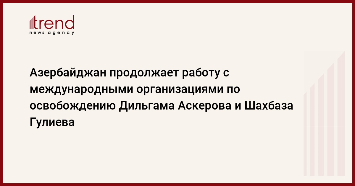 БАКУ /Trend/ - Азербайджан продолжает работу с международными организациями по освобождению взятых Арменией в заложники Дильгама Аскерова и Шахбаза Гулиева, сказал в четверг руководитель Рабочей группы Госкомиссии по делам военнопленных, заложников и без вести пропавших граждан Исмаил Ахундов в ходе слушаний в Милли Меджлисе (парламенте), посвященных Дню прав человека в Азербайджане.