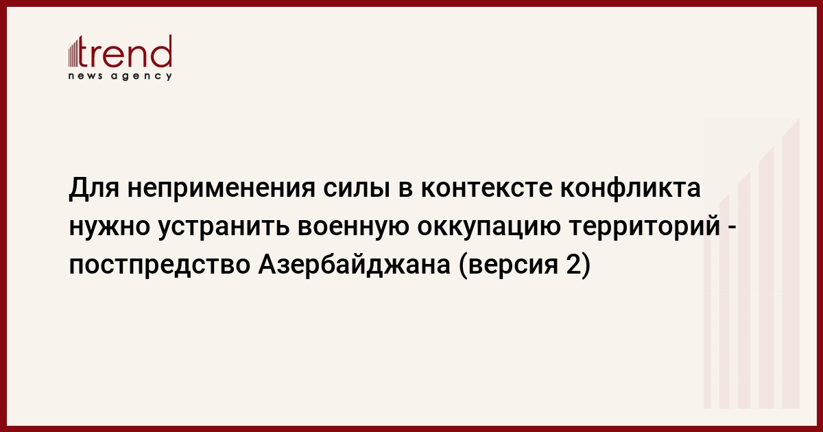 БАКУ /Trend/ - Те, кто заявляет о недопустимости применения силы в контексте урегулирования армяно-азербайджанского нагорно-карабахского конфликта, в первую очередь, должны устранить фактор военной оккупации азербайджанских территорий. Об этом говорится в понедельник в заявлении постоянного представительства Азербайджана в ОБСЕ.