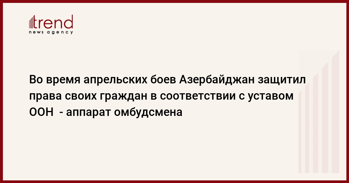 БАКУ /Trend/ - Во время апрельских боев Азербайджан, используя право на защиту от агрессии в соответствии с уставом ООН, ответил на действия агрессора и тем самым защитил права и свободы своих граждан. Об этом Trend в среду сказал руководитель аппарата омбудсмена Айдын Сафиханлы.