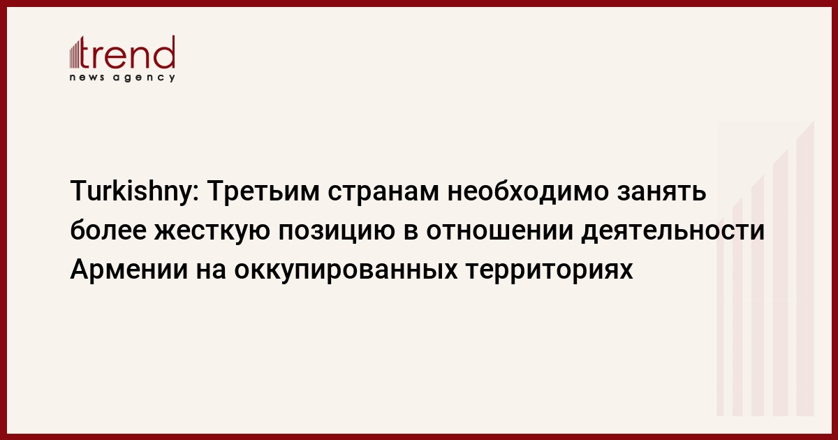 Все эти мероприятия можно рассматривать как попытку «арменизировать» оккупированные территории Азербайджана, еще более усложнить урегулирование нагорно-карабахского конфликта, тем самым сохраняя статус-кво в регионе, пишет Кылыч. К сожалению, компании третьих стран в связи со своей экономической деятельностью и некоторые организации под видом «гуманитарной помощи», также вносят вклад в неблагоприятную противоправную ситуацию на оккупированных территориях Азербайджана, пишет Кылыч. Следовательно, как отмечено в докладе, в соответствии с международным правом третьи страны также несут ответственность за поддержание такой ситуации, и виновники этих серьезных нарушений не могут рассчитывать на какой либо иммунитет, говорится в статье.