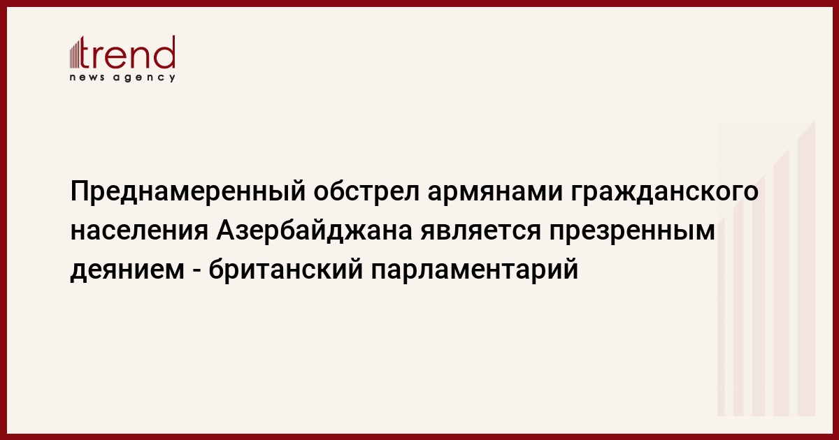 Об этом в среду в ответ на запрос Общества Европа-Азербайджан (TEAS) сказал член парламента Великобритании, руководитель межпарламентской группы дружбы Великобритания-Азербайджан Боб Блэкмен, комментируя смерть двух мирных жителей села Алханлы Физулинского района, подвергшегося четвертого июля минометному обстрелу со стороны ВС Армении.