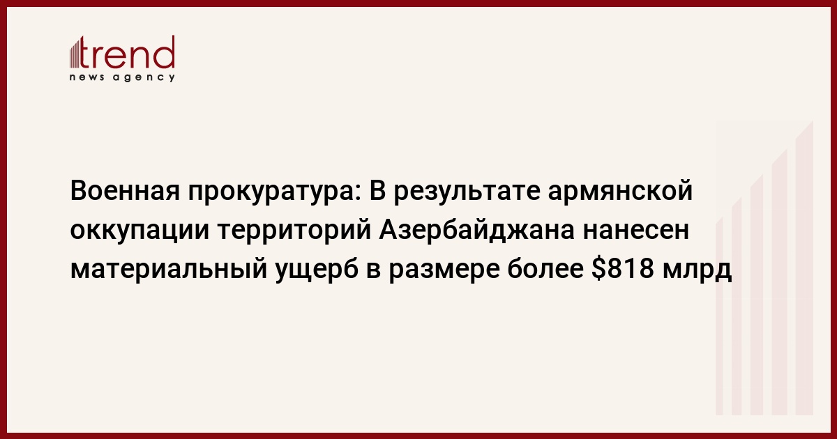 БАКУ /Trend/ - По предварительным подсчетам, материальный ущерб в результате оккупации азербайджанских территорий вооруженными силами Армении составляет 818, 880 миллиардов долларов. Об этом, выступая в среду на научно-практической конференции, посвященной 100-летней годовщине геноцида азербайджанцев 1918 года, сказал начальник Особого следственного отдела Военной прокуратуры Азербайджана Эмиль Тагиев.