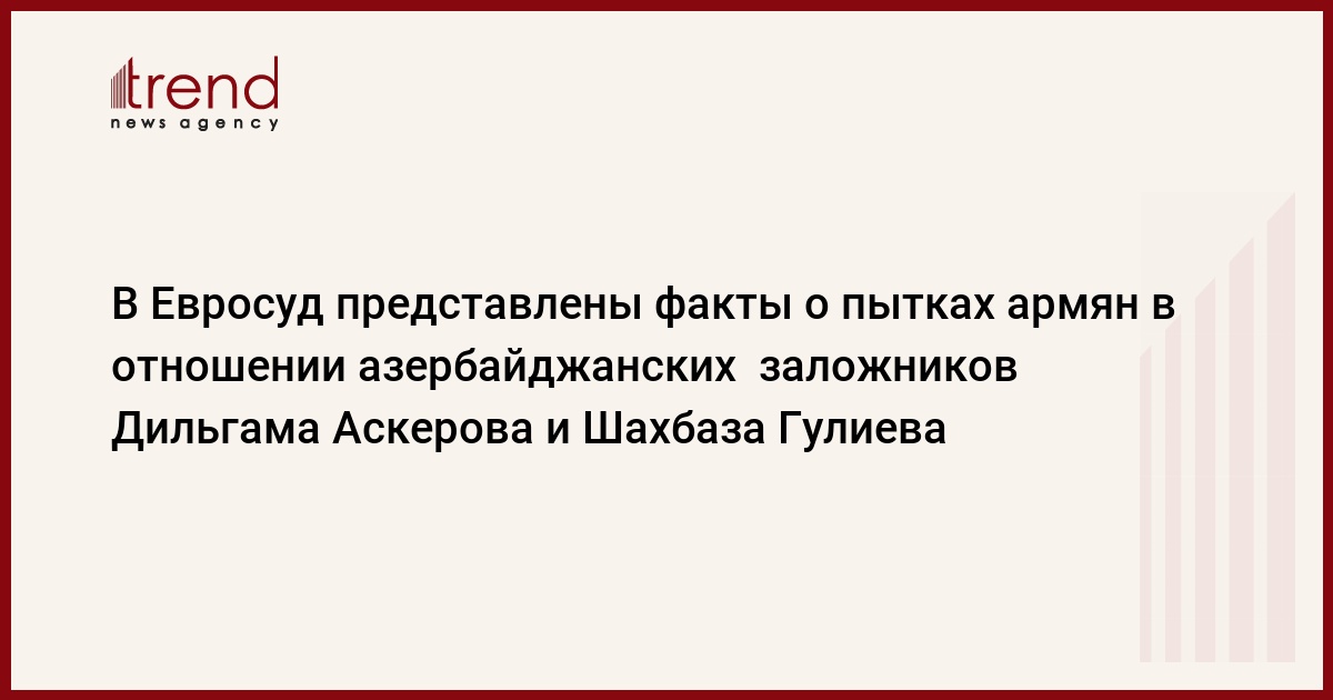 БАКУ /Trend/ - В Европейский суд по правам человека представлены документы и видеокадры о пытках в отношении азербайджанцев Дильгама Аскерова и Шахбаза Гулиева, взятых армянами в заложники в оккупированном Кельбаджарском районе. Об этом в среду сказал журналистам председатель Коллегии адвокатов Анар Багиров.